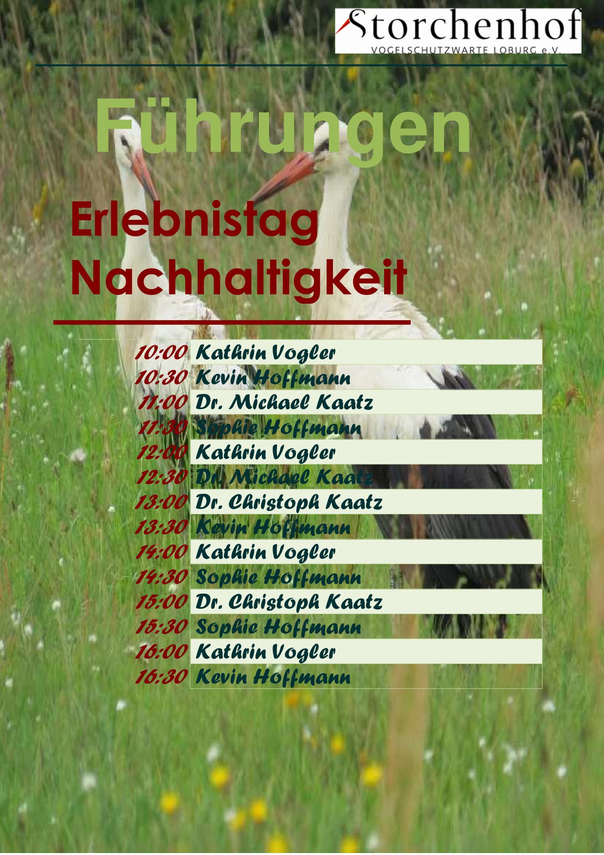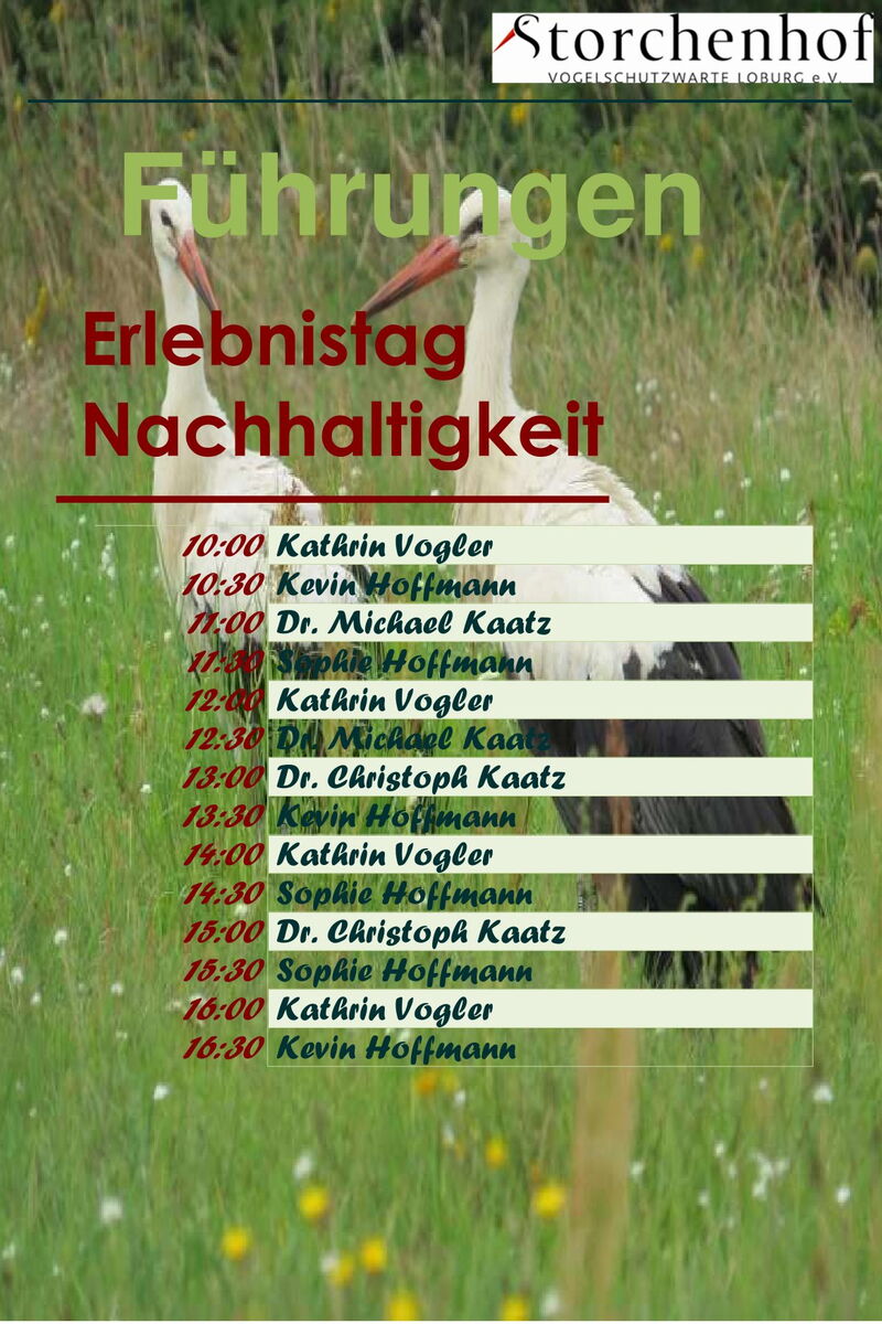- Bastelspaß im UBZ mit Stoffdrucken und Krawattenkunst mit Charleen Reich im UBZ - Kleines Buffett gegen Spende - Verkauf nachhaltiger Kerzen durch die Kerzeria - Verkauf handgefertigter Töpferwahren durch die Künstlerin Barbara Kupsch - Naturkosmetikberatung mit Produkten von „Rigana“ - Infostand vom NABU-Loburg - Um 11 Uhr und 14 Uhr Rundfahrt zu Bienenweide und zu den nachhaltig gestaltenten Walnussplantagen - Kleidertausch auf dem ganzen Storchenhof, jedes gebrauchte Teil kann mitgenommen werden - Flohmarkt vor den großen Pavillon
