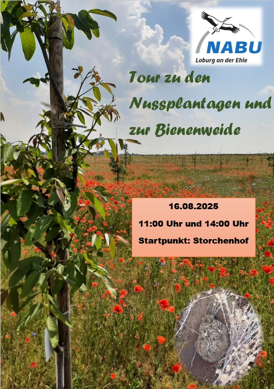 Auch der NABU Loburg wird durch einen Stand vertreten sein. Und wer sich für nachhaltigen Anbau von Walnüssen interessiert, oder dafür, was der NABU in Loburg schon alles geschafft hat, kann um 11:00 Uhr und um 14:00 Uhr eine Tour mit NABU-Chef und Gärtner Ulf Drzymala unternehmen.