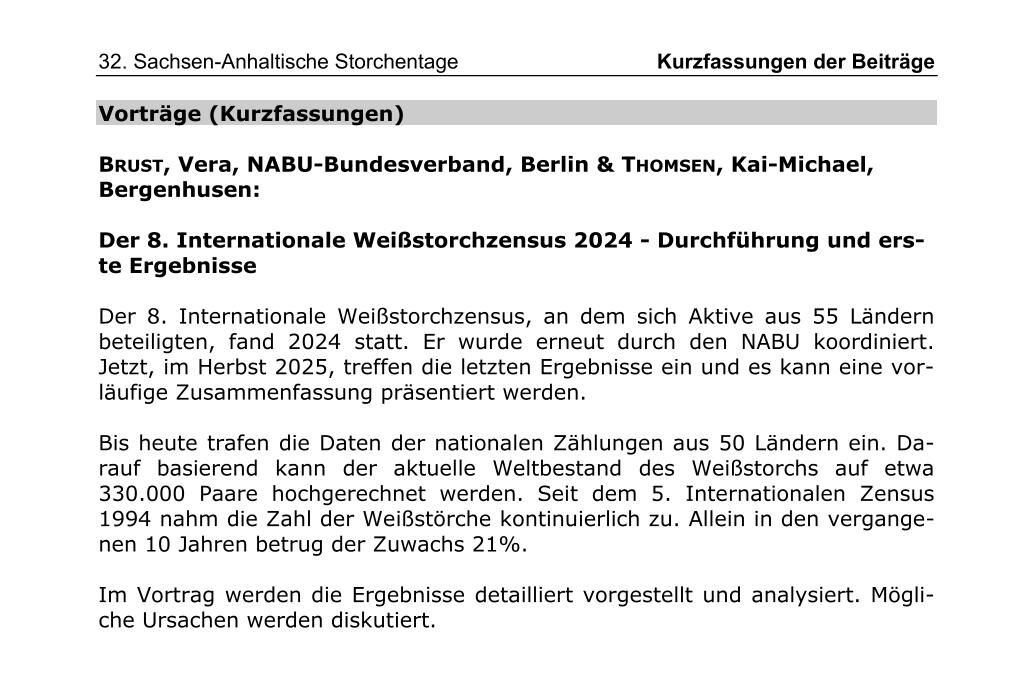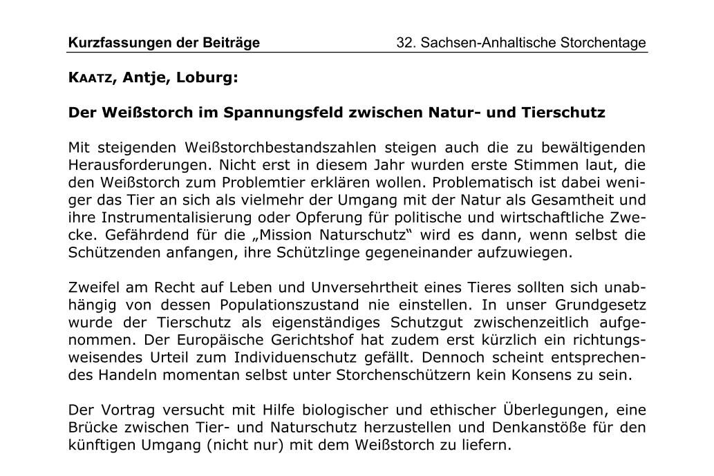 Zitat aus der Tagungsbroschüre: Der Vortrag versucht mit Hilfe biologischer und ethischer Überlegungen, eine Brücke zwischen Tier- und Naturschutz herzustellen und Denkanstöße für den künftigen Umgang (nicht nur) mit dem Weißstorch zu liefern.