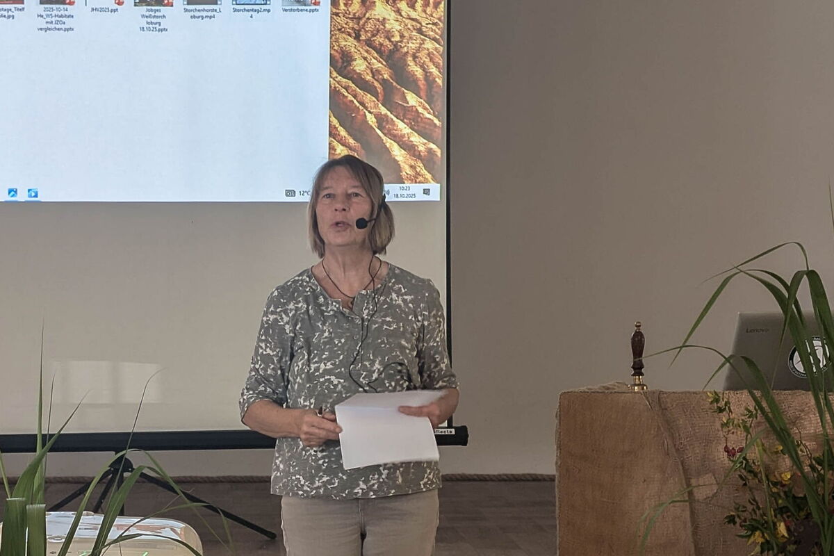 Über den Weißstorchzensus 2024 referierte Vera Brust vom NABU Bundesverband. Sie berichtete von Ergebnissen, erfolgreichen Kontakten und internationaler Zusammenarbeit.