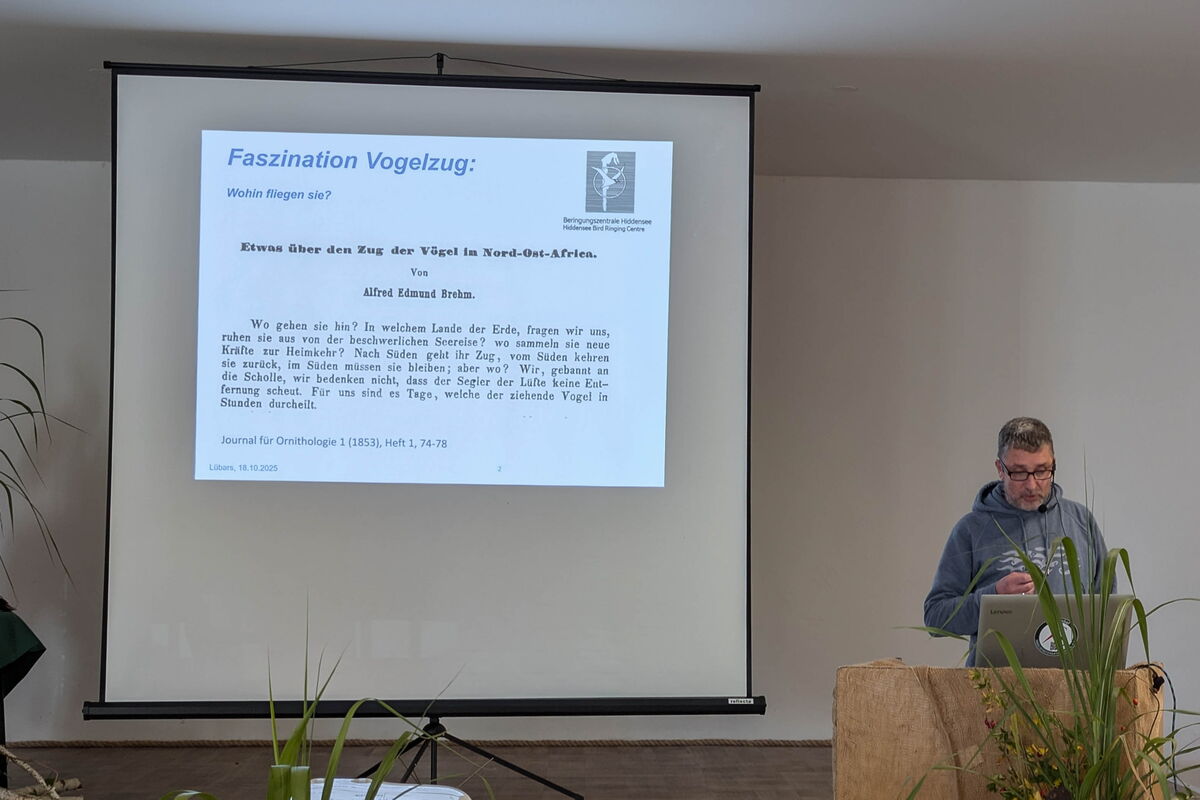 Der Leiter der Beringungszentrale Hiddensee, Dr. Christof Herrmann, gab einen Einblick in die Geschichte und die Zukunft von Vogelberingungen, insbesondere in die des Weißstorches. Er erklärte die Entwicklung der Storchenringe, deren Wiederfunde seit Beginn der Beringung durch Johannes Thienemann in Rossitten und, was Auswertungen der Wiederfunde für Rückschlüsse ziehen lassen. Die Zugscheide zwischen Ost- und Westziehern verschiebt sich zu ungunsten der Ostzieher.