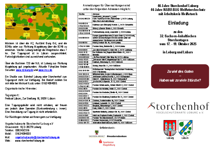 Wir laden wir zu unseren 32. Sachsen- Anhaltischen Storchentagen ein, die vom 17. bis 19.10.2025 stattfinden.