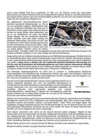 Nach diesem turbulenten Jahr sehen wir der Zukunft dennoch positiv entgegen. Möglich ist das insbesondere dank der weitsichtigen und flexiblen Tätigkeit des Vorstandes mit der Geschäftsführung und der aufopferungsvollen Arbeit der Storchenhofmannschaft. Unentbehrlich ist die Unterstützung der Vereinsmitglieder, Sympathisanten, Gäste und Besucher und das wohlwollende Entgegenkommen von Politik, Verwaltung, Betrieben, Einrichtungen und Vereinen und so wünschen wir uns: