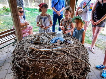 Mutige Barfüßler dürfen an unserem Fühl-Pfad ihr Können unter Beweis stellen, wer hält es am längsten auf den Tannenzapfen aus? Auch die Hände kommen nicht zu kurz, an mehreren Fühlstationen, die auf dem Gelände verteilt sind. Zwar ist es nicht erlaubt, die Störche zu streicheln, aber die Federn von Tauben oder Hühnern sind genauso weich. Und es kitzelt so schön, wenn sie Körner aus der Hand fressen.