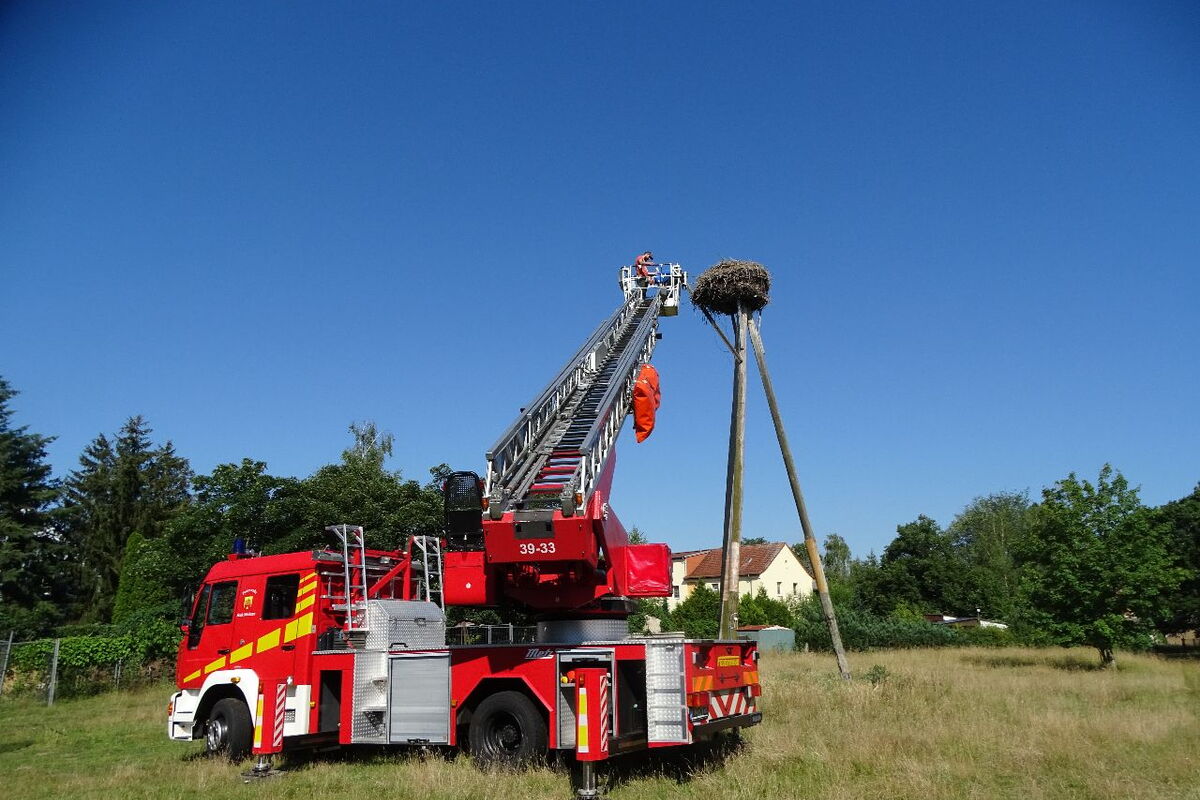 Auf dem Wiesenhorst konnten wir in diesem Jahr nur einen Jungstorch mit einem Ring ausstatten. Seine drei Geschwister flogen ab, als sie das ehemalige Feuerwehrauto mit der Hubbühne kommen sahen.