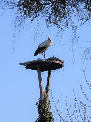 Zwischenzeitlich ließen sich zwei weitere Störche hier nieder, aber einzeln, nicht als Paar. Ein Radolfzell-Ring-Storch ist inzwischen weitergeflogen und ein im Jahr 2018 beringter Storch aus der Prignitz steht seit Stunden auf dem Horst am Teichgarten, nachdem er den Horst am Eingang nur kurz inspiziert hatte..
