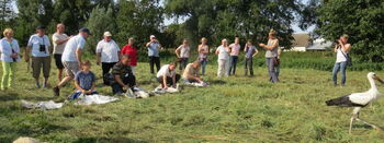 Zahlreiche Interessierte und Beobachter wohnten der Auswilderung von fünf Jungstörchen am 03.September 2016 im Ehle-Renaturierungsgebiet bei.