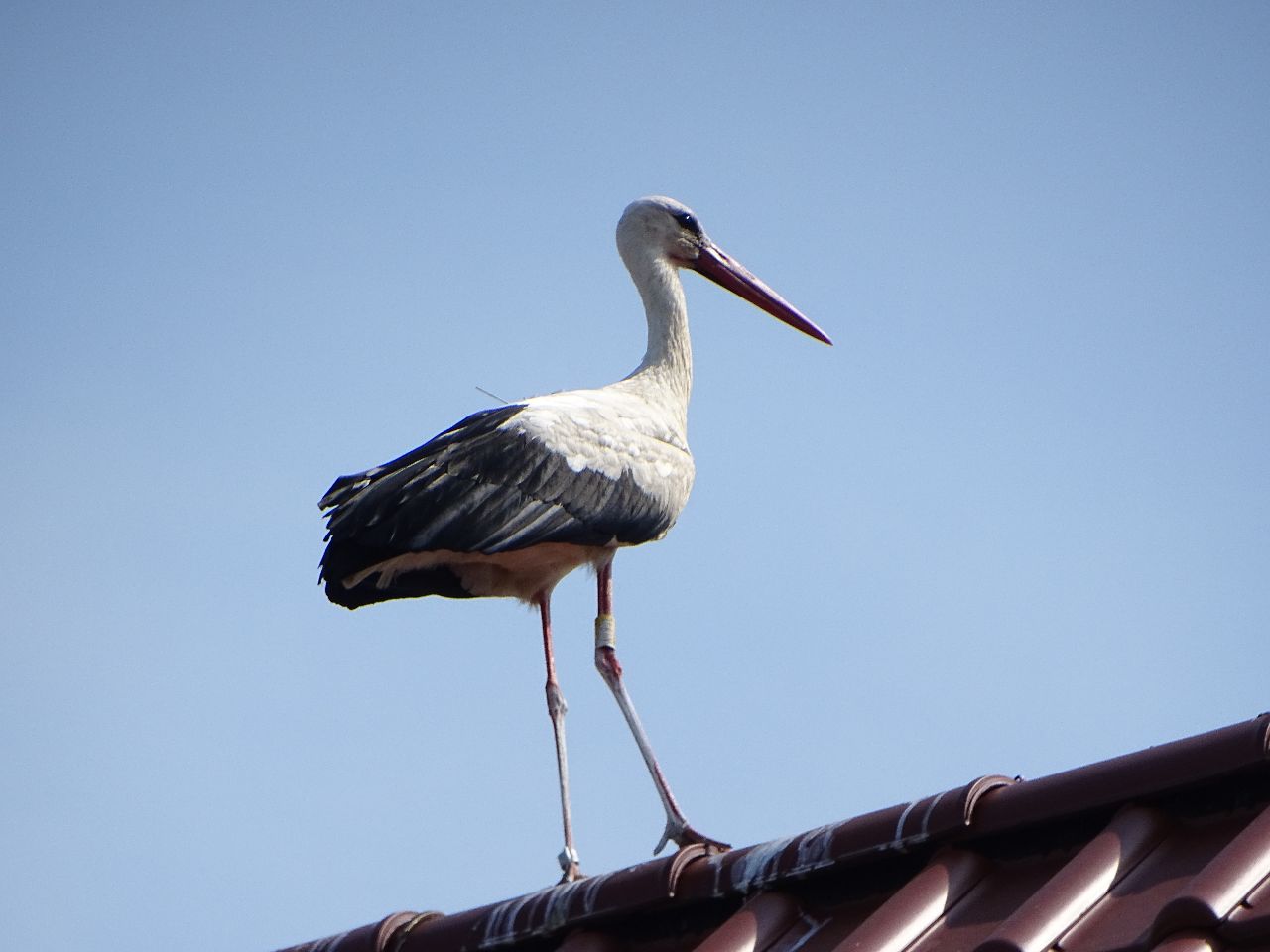 Als das bemerkt wurde, zückte Frau Kaatz ihre Kamera und schaute nach. Ein Foto gelang ihr noch, bevor Mika mit einem unberingten Jungstorch wegflog.