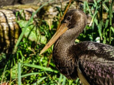 Portrait Schwarzstorch vor grünem Gebüsch