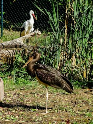 Schwarzstorch im Auslaufgehege, im Hintergrund ein Weißstorch