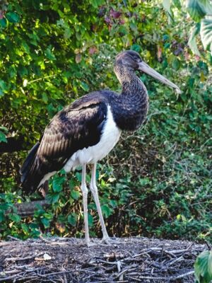 Schwarzstorch mit weißer Brust vor grünem Gebüsch
