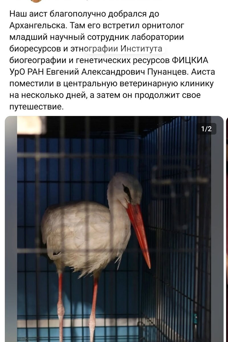 "У нас всё получилось. В понедельник мы встретили Евгения. Он в порядке. Крупный аист. Осмотрела пальцы, моё предположение об отморожении не подтвердилось, может быть так сфотографировано было. Все пальцы целые, без повреждений и отёков. Худой он, киль сильно выпирает. Видимо, он летел пока силы были. Теперь ему отъедаться и отдыхать нужно.