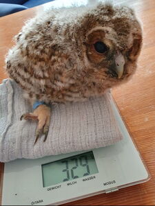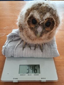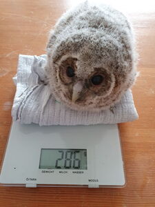 Der anfänglich sehr große Hunger pegelte sich schnell ein, als die Käuzchen gemerkt hatten, dass bei uns niemand zu kurz kommt. Aktuell wird noch zwei Mal täglich gefüttert – Mäuse stehen auf dem Speiseplan –, wobei die Eulchen ihre Hauptmahlzeit zu ihrer Hauptaktivitätszeit in den späten Abendstunden bekommen. Die Gewichtskontrolle ergab: alle drei nehmen zu (und auch der Output ist ganz wie er sein soll).