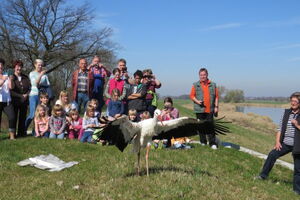 Die Auswilderung erfolgte bei herrlichstem Wetter und guter Stimmung, auch in Anwesenheit einer Kindergartengruppe, die dem Storch auch ein Ständchen brachte.
