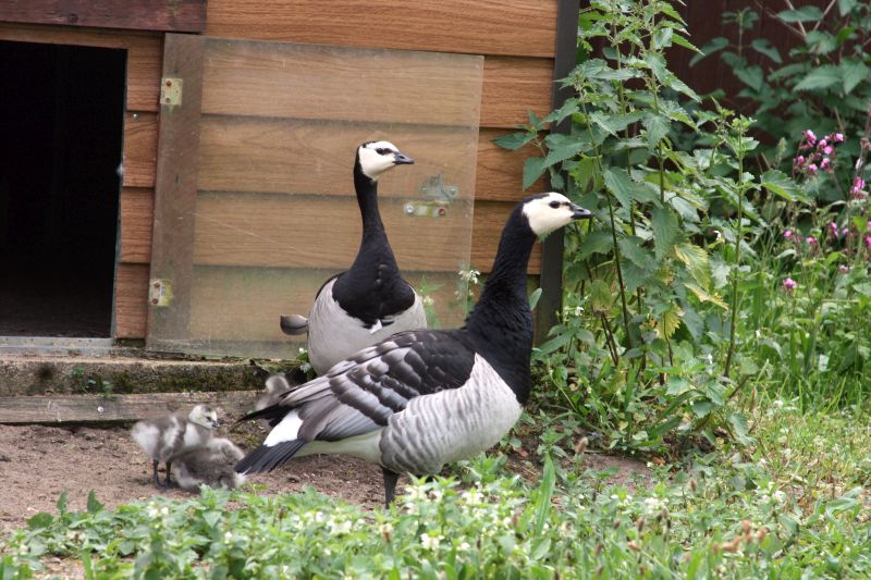 Die Nonnengänse freuen sich über drei flauschige Küken, welche sie auch eifrig beschützen, wenn die Mitarbeiter ihr Gehege betreten, um frisches Wasser nachzugeben.
