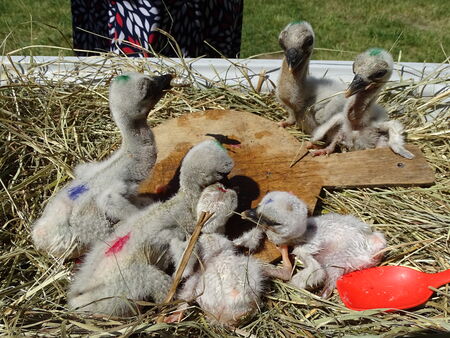 Auf dem Foto, das hier auf dem Storchenhof nach der Ankunft entstanden ist, sind die 4 "großen" Gothmänner" mit den beiden bereits geschlüpften Lossowern zu sehen.