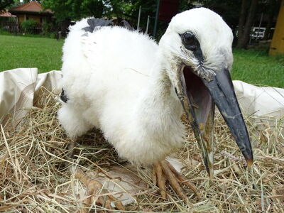 Derzeit befinden sich kleine, vor nicht einmal einem Monat geschlüpfte Störche zum Aufpäppeln auf dem Storchenhof.