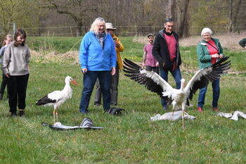 Bevor sich die doch recht zahlreichen Gäste an diesem milden und sonnigen Samstag vor Ostern in das Auswilderungsgebiet begaben, wurden alle Störche wie gewohnt gewogen und beringt, sofern sie es noch nicht waren.