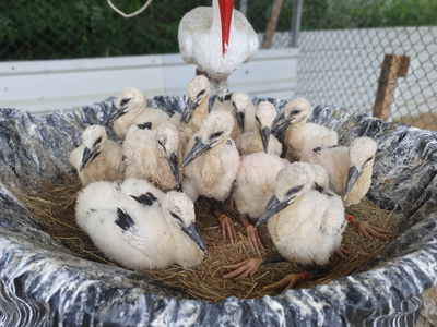 18 Jungstörche und ein paar Eier - aus Platzmangel hier nicht alle auf dem Foto.