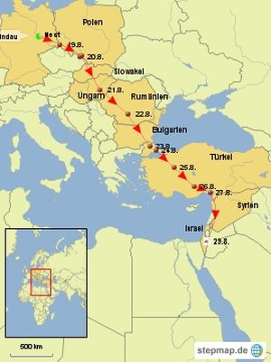 Rolando ist nun schon in Israel. Nachdem wir am 28. keinen Empfang hatten, erreichten uns vom 29.8. wieder aktuelle Daten. Danach war er am Abend etwas westlich von Arad.