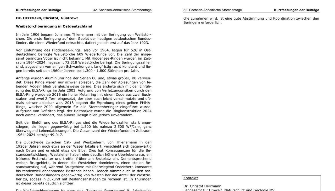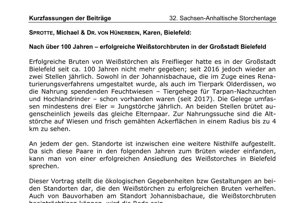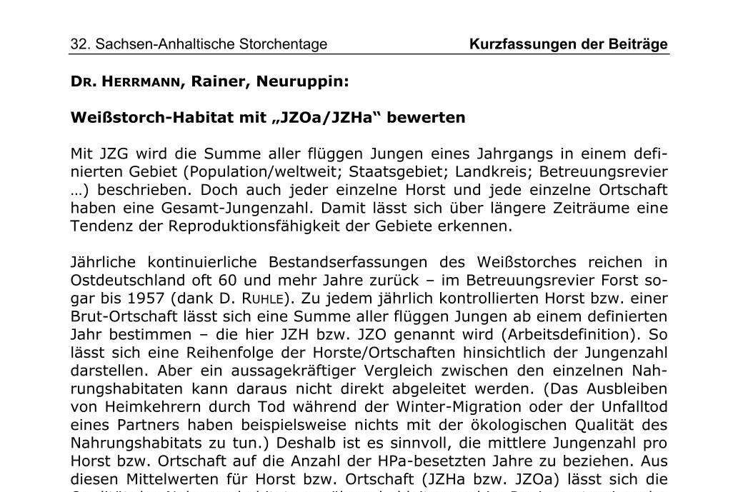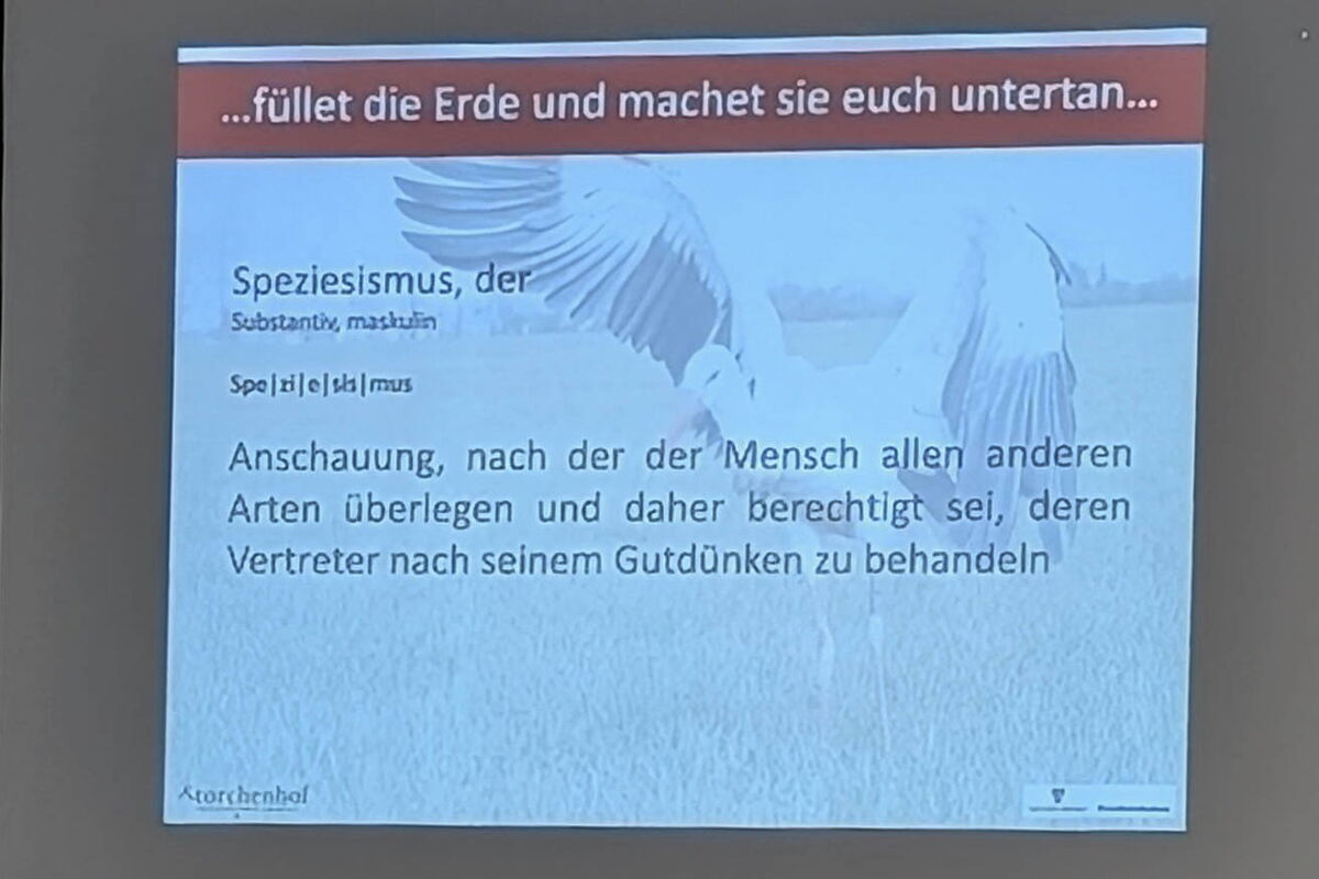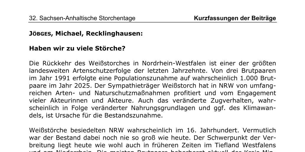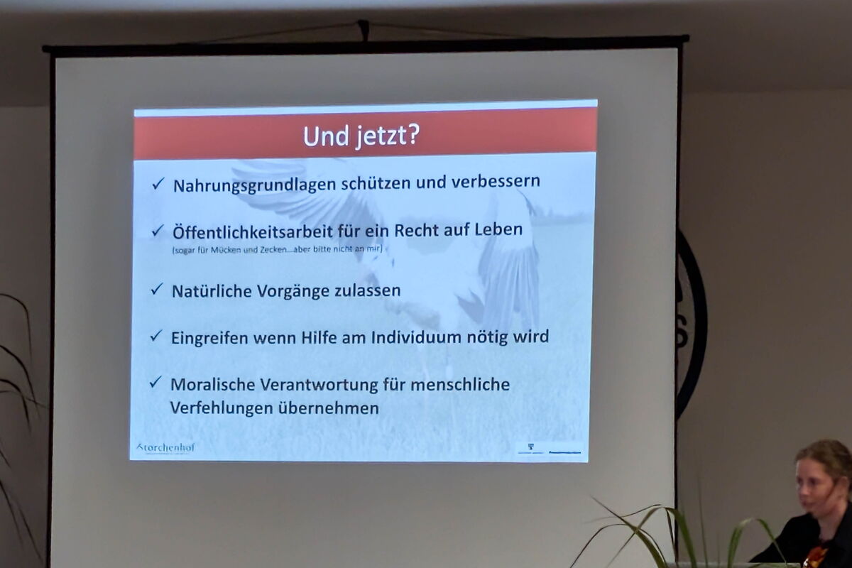 Zitat aus der Tagungsbroschüre: Der Vortrag versucht mit Hilfe biologischer und ethischer Überlegungen, eine Brücke zwischen Tier- und Naturschutz herzustellen und Denkanstöße für den künftigen Umgang (nicht nur) mit dem Weißstorch zu liefern.