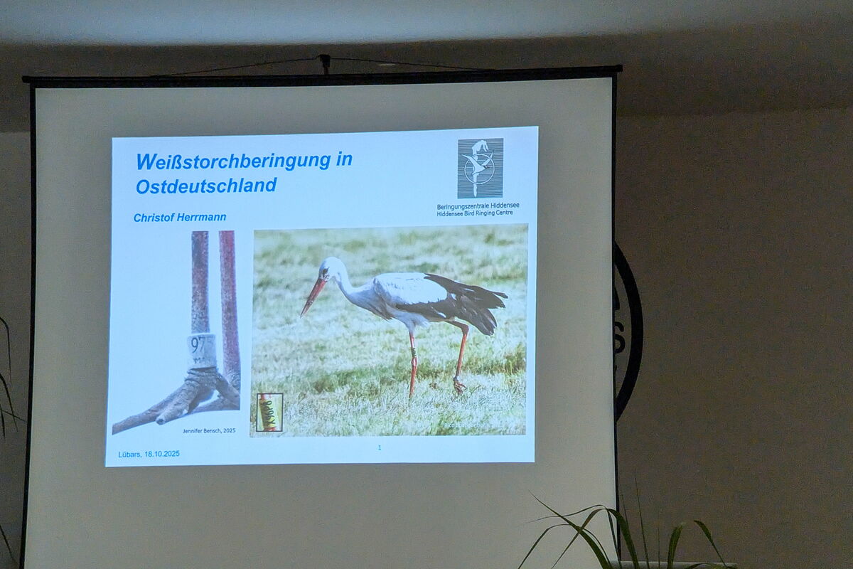 Der Leiter der Beringungszentrale Hiddensee, Dr. Christof Herrmann, gab einen Einblick in die Geschichte und die Zukunft von Vogelberingungen, insbesondere in die des Weißstorches. Er erklärte die Entwicklung der Storchenringe, deren Wiederfunde seit Beginn der Beringung durch Johannes Thienemann in Rossitten und, was Auswertungen der Wiederfunde für Rückschlüsse ziehen lassen. Die Zugscheide zwischen Ost- und Westziehern verschiebt sich zu ungunsten der Ostzieher.