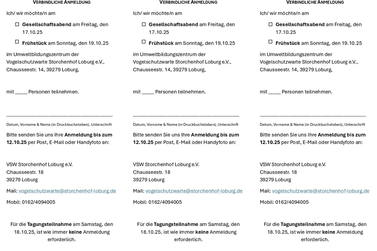 Wer vorher oder nachher in der Nähe übernachtet, hat die Möglichkeit, am Freitag, den 17.10. an unserem Gesellschaftsabend und/ oder am Sonntag, den 19.10. am gemeinsamen Frühstück teilzunehmen. Hierfür bitten wir um vorherige Anmeldung bis zum 12.10. (am besten per Mail an: vogelschutzwarte[at]storchenhof-loburg.de).