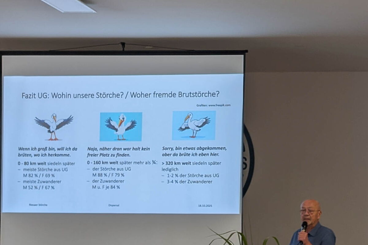 Nach der Mittagspause erläuterte Dr. Peter Kneis eine statistische Untersuchung zur Ab- und Zuwanderung von Weißstörchen im Beobachtungsgebiet Riesa/Sachsen. Derartige Untersuchungen sind nur möglich, wenn es häufige Ablesungen von beringten Störchen gibt. Als Ergebnis wird festgestellt, dass sich die brutfähigen, weiblichen Störche auch schon auf dem Zugweg einen Partner und ein Nest suchen, während die jungen Storchenmänner lieber näher an ihren Geburtsort zurückkehren.