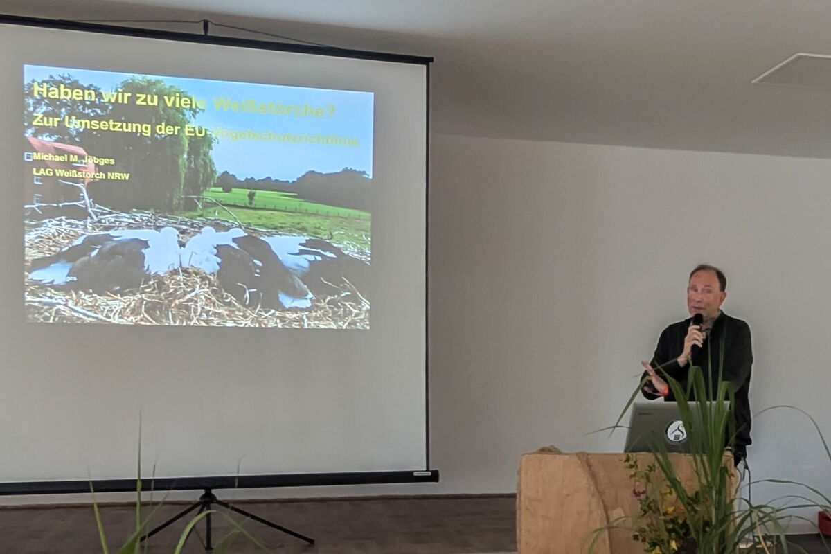 Aus Nordrhein-Westfalen reiste Michael Jöbges zur Tagung an und berichtete von den Problemen beim Weißstorchschutz, insbesondere, was die Toleranz der Menschen aber auch, was die Statik von Gebäuden oder Strommasten angeht, sie halten mehr aus, als man denkt. Als Beispiel nannte er das Schloss Heessen in Hamm. Dort wurden in der vergangen Woche die Nester abgebaut. Solche Maßnahmen können angebracht sein, vor allem wenn es um sichere Wege geht, aber sie sind nicht immer erforderlich. Die Störche sind auch nicht immer auf Nisthilfen angewiesen, sie bauen sich selbst Nester, auch auf Bäumen. Er bemerkte bereits selbst, dass er nicht alle Storchenhorste erfassen konnte, weil sie ihm noch unbekannt waren. Er wurde erst von Anwohnern darauf aufmerksam gemacht.