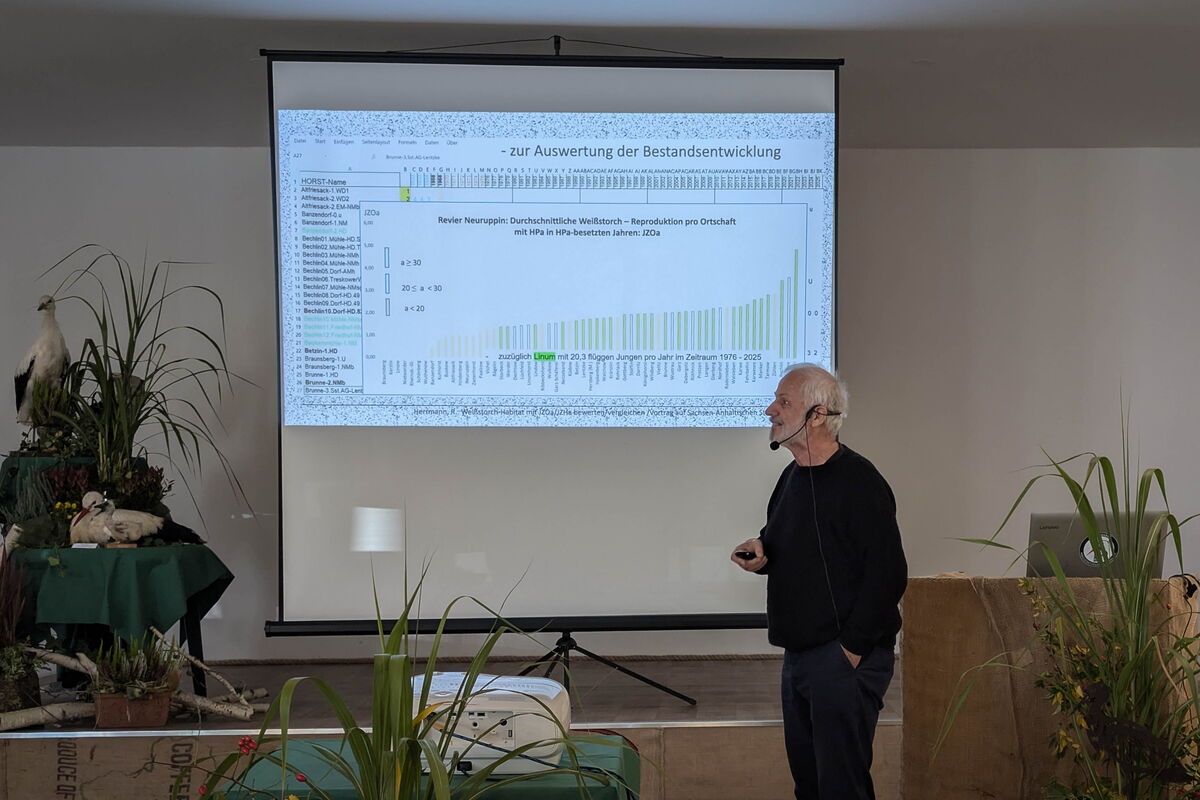 Seit Jahrzehnten ist Dr. Rainer Herrmann bekannt für seine Methodik bei der Auswertung von Ablesedaten von Weißstörchen. Diesmal referierte er über die Möglichkeiten, die das Programm Excel bietet, Brutergebnisse auszuwerten. Anhand der gesammelten Daten in Neuruppin/Brandenburg erklärte er in seiner Präsentation, was alles möglich ist, um die Reproduktionstauglichkeit eines Gebiets zu bestimmen.