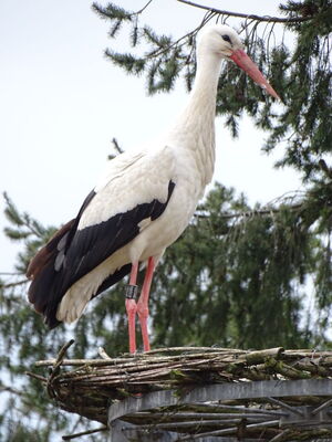 Zwischenzeitlich ließen sich zwei weitere Störche hier nieder, aber einzeln, nicht als Paar. Ein Radolfzell-Ring-Storch ist inzwischen weitergeflogen und ein im Jahr 2018 beringter Storch aus der Prignitz steht seit Stunden auf dem Horst am Teichgarten, nachdem er den Horst am Eingang nur kurz inspiziert hatte..