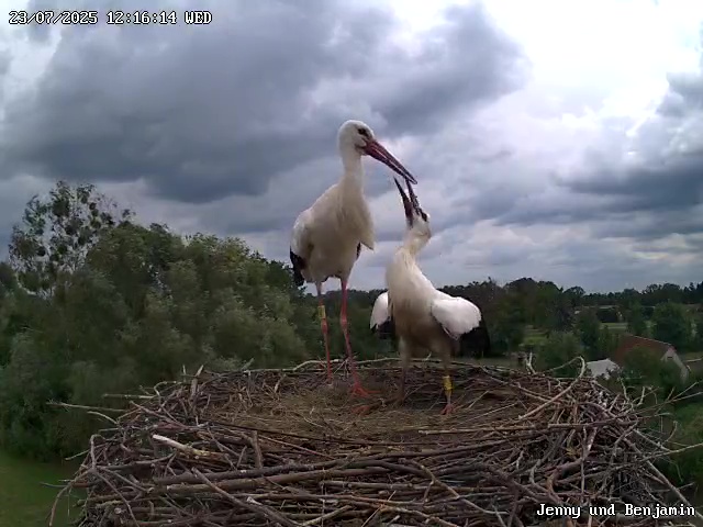 Auf dem Storchenhof hat gestern eine unberingte Storchendame Einzug gehalten. Warum sie oben noch nicht bei einem der Nester zugeordnet ist? Sie ist noch unentschieden. 😅 Storchenhochzeit gab es bereits sowohl mit Benjamin als auch mit Heinz. 🤭 Aktuell sieht es danach aus, dass sie sich eher zu Benjamin hingezogen fühlt. Warten wir mal ab, was die kommenden Tage noch so bringen. Und dann stellt sich ja auch noch die Frage nach der verspäteten Wally. Kommt sie noch?