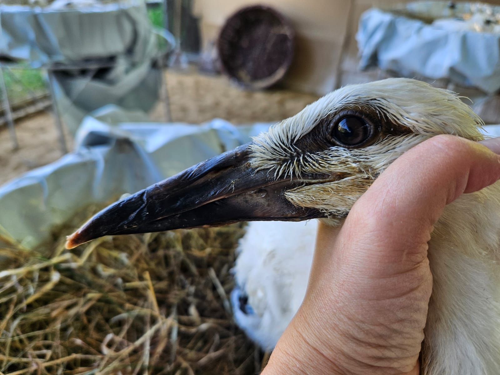 Fehlt Protein zum Muskelaufbau bevor die großen Flügelfedern wachsen, können die mit Blut gefüllten Federkiele zu schwer für den kleinen Storchenflügel werden und diesen in eine ungünstige Stellung ziehen. Hier kann man mit ein paar Tagen Flügelbandage Abhilfe schaffen.