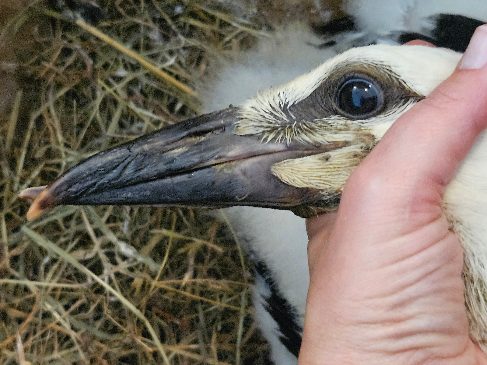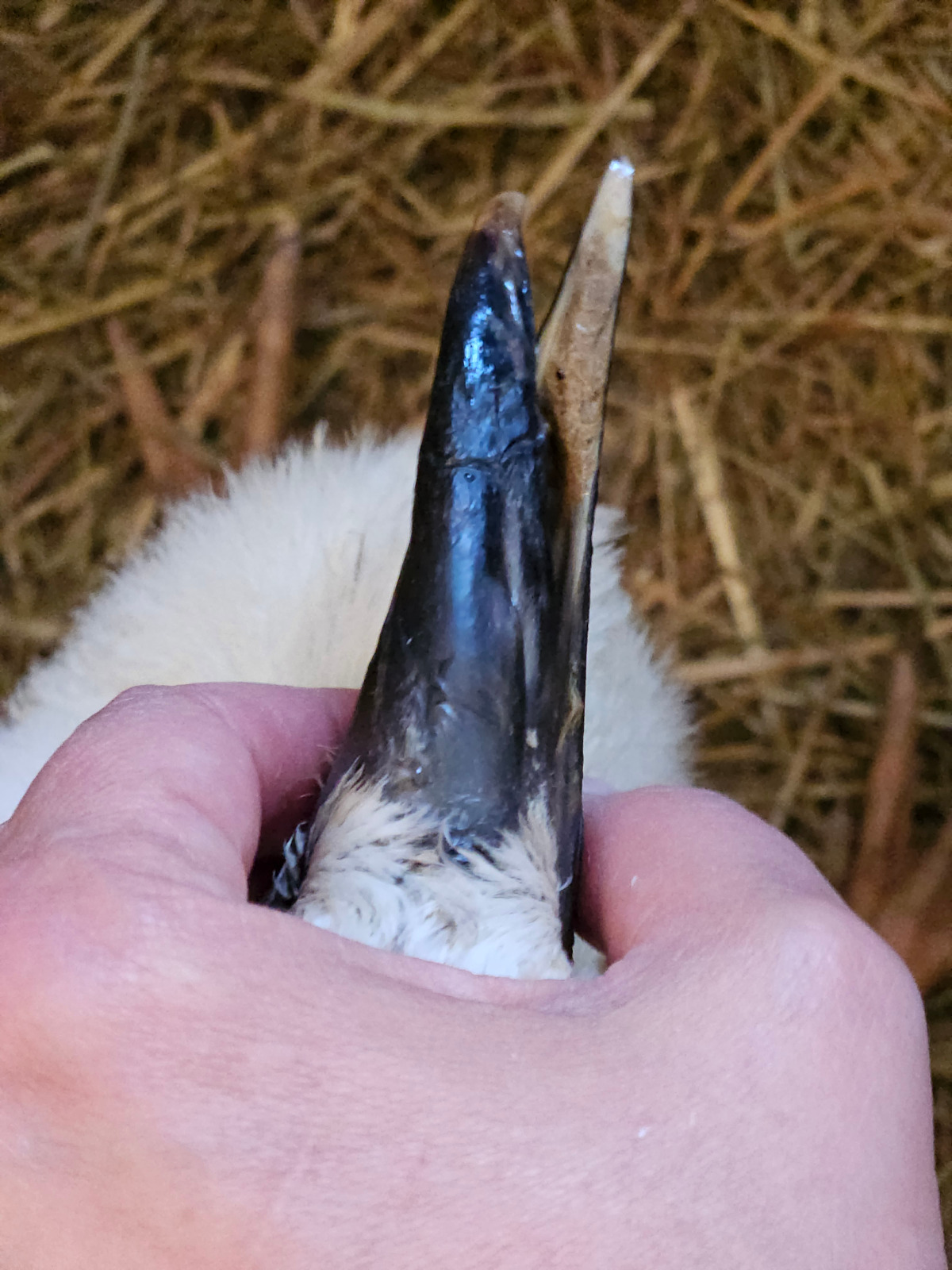 Manch einer fragt sich vielleicht, wieso wir nicht einfach Ober- und Unterschnabel aneinandergebunden haben. Bei einem voll verfestigten Knochen wäre das eventuell eine Option gewesen. Allerdings haben wir es hier mit einem Baby zu tun, dessen Knochen alles Mögliche, nur nicht fest sind. Ganz besonders nicht die zarten Knöchelchen des Unterschnabels, der gegen den Druck des stark verformten Oberschnabels hätte gegenhalten müssen. Dieser besteht aus zwei dünnen Knochen, die nur an der Spitze miteinander verwachsen sind (ähnlich wie unser menschlicher Unterkieferknochen). Wie zart und entsprechend leicht zu verformen oder beschädigen diese Knochen bei einem jungen Storch sind, kann man sich anhand der Schnabelgröße natürlich denken.