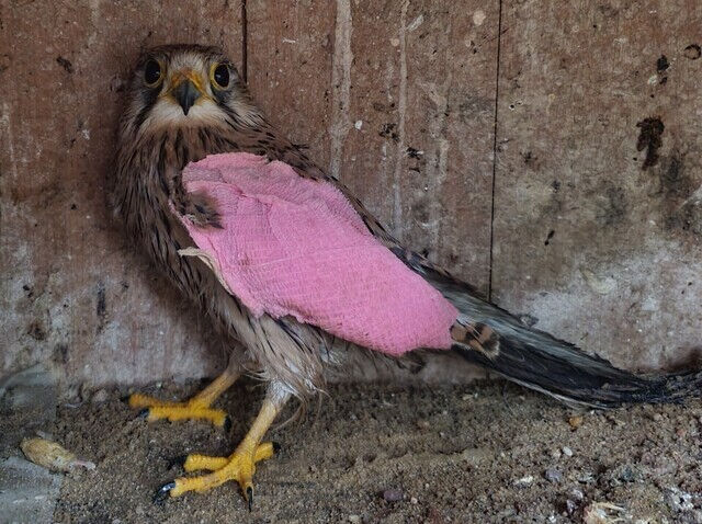 Turmfalke mit Flügelverband nach Bruch