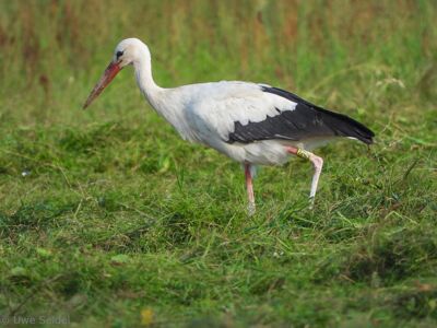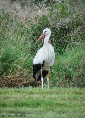 Weißstorch auf einer Wiese vor grünem Gebüsch