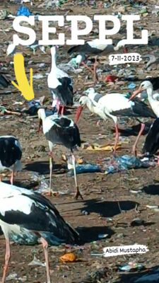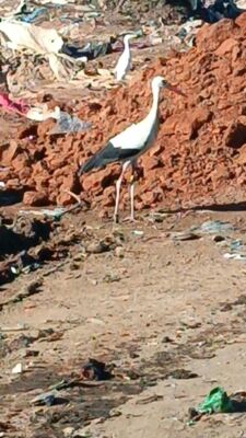 Handybild eines Weißstorches auf einer Mülldeponie oder ähnlichem