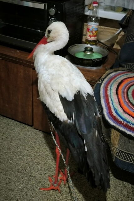 Aus dieser Situation haben Bürger der Gemeinde Nes den Storch gefangen. So ganz freiwillig wollte er wohl nicht mit, deswegen hat man ihn mit einer Leine sichern müssen. Eugen ist etwas unkooperativ, aber das war er auch auf dem Storchenhof.