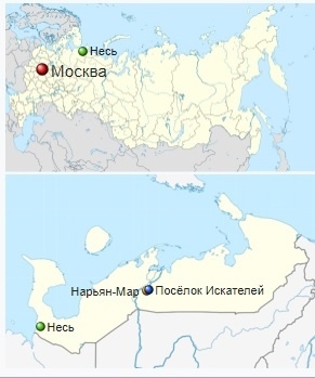 Statt nach Süden, flog Eugen nach Nordosten. Ende November herrschten in der Region Temperaturen in der Nacht bis - 8°C und die Region ist verschneit und gefroren, wie das Radarbild zeigt. Eugen wurde ja am zugefrorenen Fluss Nes beim Dorf Nes gefunden. Das ist schon sehr weit nördlich. Auf der Suche nach Fotos aus dieser Region im Internet stießen wir auf einen Reisebericht. Die Bilder sprechen für sich, so in etwa könnte es im Hochwinter dort aussehen.. Allerdings liegt derzeit wohl nur wenig Schnee, es ist eher matschig und nass. Auch hier macht sich die Klimaerwärmung bemerkbar. Einen kleinen Eindruck kann eine Webcam (НАО, с. Несь, Арт-Объект - Seite 2, ganz rechts) vermitteln.