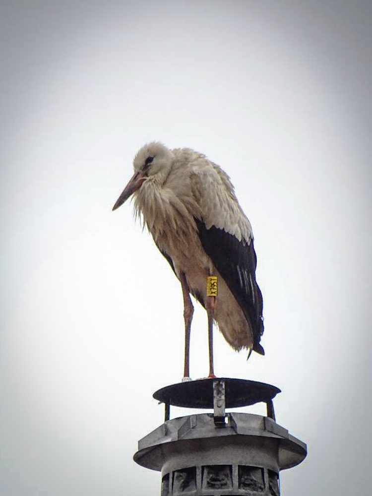 Schmuddelwetter heute. Frau Karl zieht den Kopf vorm Sprühregen ein... Sie steht gegenüber des Storchenhofes auf einem Schornstein.