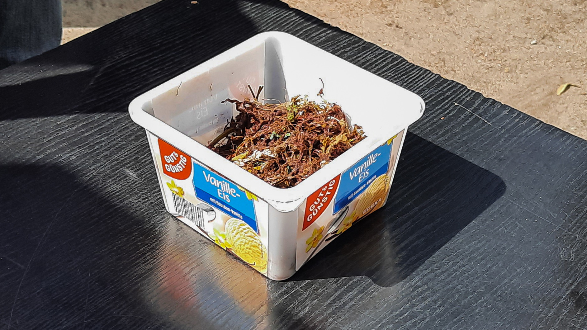 Als erstes wurde die Problematik Müll im Storchenmagen angesprochen, denn am Morgen des gleichen Tages wurde ein bereits verstorbener Storch überbracht, dessen Magen auch wieder voll mit Unverdaulichem war. Man hat das zu Präsentationszwecken in einer luftdichten Dose aufbewahrt, und als diese dann geöffnet und der Inhalt mit diversen Gummibändern gezeigt wurde, schlug einem ein sehr unangenehmer Geruch entgegen. Der Inhalt der Dose war noch frisch. Sophie erklärte die Zusammenhänge und appellierte auch an die Besucher, selbst auch auf den Umgang mit Bioabfällen zu achten.