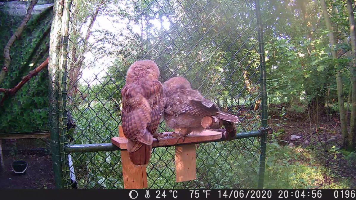 Doch zunächst nochmal ein kleiner Rückblick: Nachdem die Käuzchen gebracht worden waren, galt es zunächst, unbedingt die folgenden Fragen zu klären. Wie ist ihr Allgemeinzustand? Fressen sie (selbständig)? Setzen sie normal Kot ab? Verhalten sie sich irgendwie auffällig? Das lässt sich auf unserem Gelände am besten mit einer – zugegebenermaßen – etwas unkonventionellen Lösung herausfinden. Die Käuze kamen ins Archiv. Der Raum ist sehr ruhig gelegen und hat praktischerweise ein Fenster zum Flur, durch das man die Abteilung „K“ wie Kauz ;) von den Vögeln unbemerkt einsehen kann. Damit war es unserer Mitarbeiterin möglich, in verhältnismäßig kurzen Zeitabständen nach den Pfleglingen zu sehen, ohne jedes Mal mit ihnen interagieren zu müssen. Auch die Wege für die anfangs noch häufigeren Fütterungen (4 Mahlzeiten am Tag) konnten so minimiert werden. Zusätzlich versorgte uns eine Wildkamera mit einigen unerwartet ulkigen Schnappschüssen.