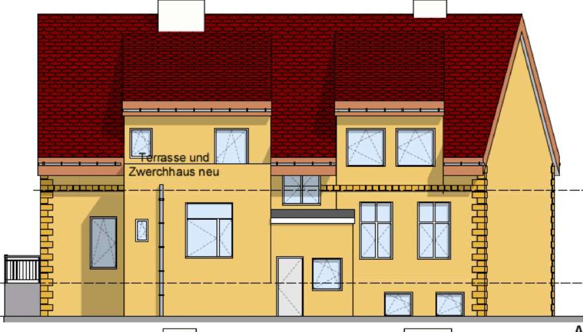 Hierfür muss das über 100 Jahre alte Gebäude grundlegend saniert werden. Für den langfristigen Erhalt der Bausubstanz und als Grundlage für den späteren Innenausbau sind zunächst die Erneuerung und adäquate Dämmung des Daches und der Fenster nötig. Ein neuer Anstrich verhilft der ortsbildprägenden Fassade zu neuem Glanz und schützt vor weiterem Verfall (siehe Ansicht auf der Rückseite).
