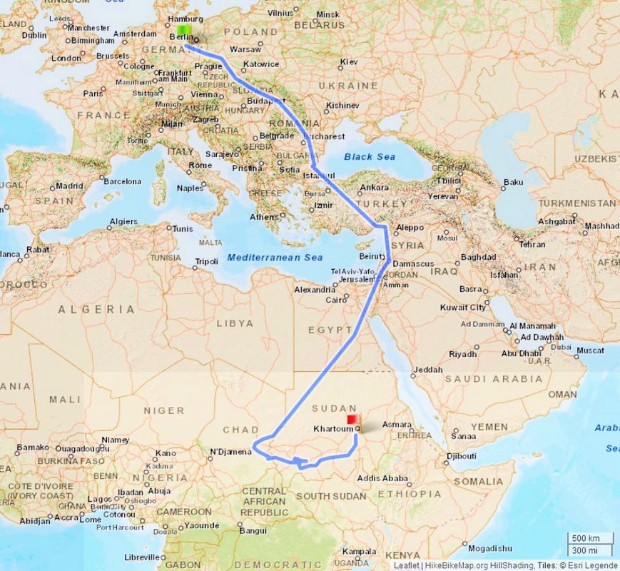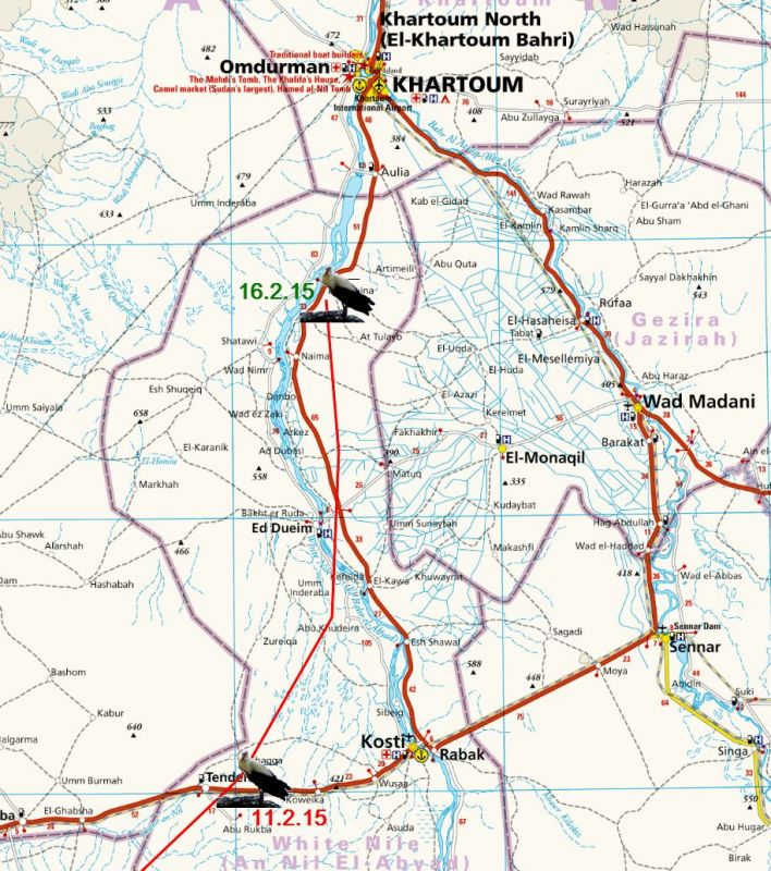 Bis zum 7. Februar durchstreifte Albert den Süden vom Sudan noch wenig zielgerichtet, wobei er sich schon ein wenig nach Osten orientierte. Erst am 8. Februar war eine andere Richtung zu erkennen. Mit 60 km am 8.2. und dann 120 km am 9.2. zog er erstmals wieder geradliniger, ohne große Umwege. Auch am 10. und 11. Februar waren es jeweils um die 100 km Richtung Osten. Dann jedoch schwieg sein Sender wie bereits erwähnt bis zum 15.2., sodass wir die folgenden Tage keine Positionen erhielten. Die nächste Positionsmeldung seines Senders, die dieser übermittelt, war vom 15.2. gegen Mittag und kam schon vom weißen Nil. Diesen hatte Albert bereits überflogen, wand sich nach Norden und folgt nun dem östlichen Ufer vom Nil. Aktuell war Albert gegen Mittag des 16.2. nahe EL-Geteiner, einer kleinen Stadt am Nil, nur noch 85 km von Khartum entfernt.